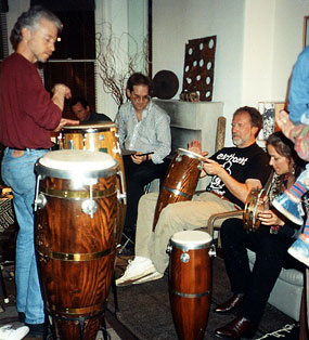 The basic idea behind that post-earthquake jam was, "Hey--everybody's out-of-sync. Let's see if we can come up with some activity that will get us all back on The Beat again." We figured that if we sat down with a bunch of instruments and a serious desire to listen and play with each other, somehow the rhythm would just find us and make everything all better again. The first official Drum-Out was held New Year's Eve-Eve, l989. Most of the instruments came from a Latin percussion auction that was serendipitously held a few weeks before our event. (Congas for $50.00, A dozen Claves for $1.25 each!) About 50 people came over to find The Beat with us, and memories of it were positive enough to consider hosting D.O. 2. Drum-Out 2 was held on New Year's Eve-Eve, 1990. About 90 people (only some of whom we knew) came over to find The Beat with us, and the anarchic pounding that resulted from that madness could be heard waaay down the block. This time, we had gone too far. After much throat clearing and hand wringing, Drum-Out 3 was finally scheduled for February 29, 1992 - Leap Year Night. This event began as a more sensitive, scaled-down event focusing more on listening and interacting than on brute cathartic release. Things began tentatively - nobody wanted to rush or impose too much - so when The Beat finally hit, it exploded. In 1994, the Drum-Out tradition moved to Sausalito. Drum-Out 6 seemed to fit well into our new home, and by Drum-Out 7, many of our neighbors were coming over to join in the chaos. At Drum-Out 9, a new wrinkle was added when the wonderful musician Dean Monroe (fresh from Drum Circles in Santa Cruz) stood in the center of the room and conducted. Another great addition to our festivities is the Official Drum-Out Shuttle-Jeep (ably manned by our friend Sam Hsu) which transports guests from the parking to the drumming and back again. With Drum-Out 12 looming on the horizon, we are extremely pleased to be taking our proud tradition to the World Wide Web. Special thanks to our pal and D.O. regular Bill Krauss for making this a reality. If you like his work, you may consider contacting him to find out what he can cook up for you.